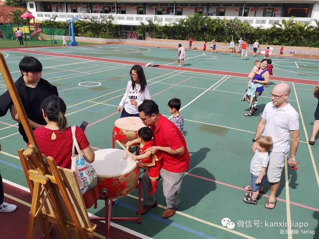 篮球场另一边,幼儿园的小朋友们在排队体验华人传统的大鼓,看这个红衣服的爸爸,大腿手臂齐上,抱着跃跃欲试的宝贝: