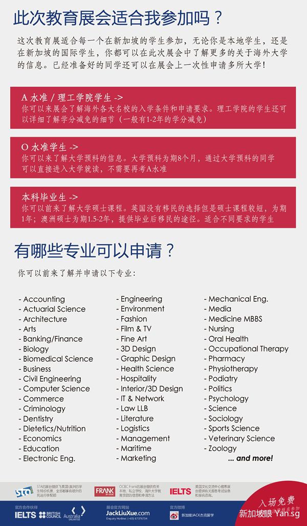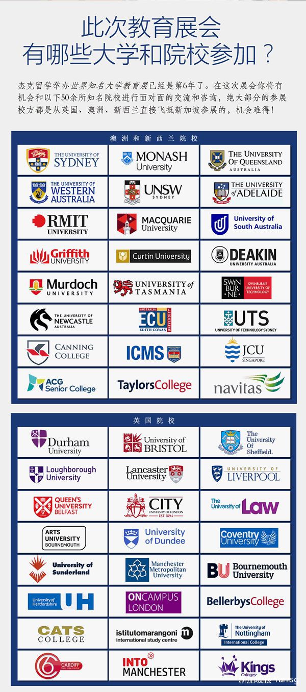 每年我们都准时来!每年都给新加坡的同学带来最优秀的海外大学!这次有孕育澳洲五位总理的悉尼大学、名校UNSW、世界排名前50的昆士兰大学、英国仅次于牛津剑桥的杜伦大学。不要错过哦~~