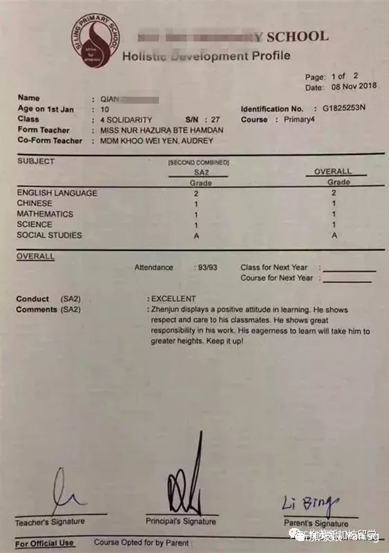 ……现在就让我们拿孩子们的成绩单来说话吧!拿孩子们在学校里的笑脸来让您放心吧!01Q:英语全班第一!总分全班第一!这是刚考入新加坡的孩子的成绩吗?A:没错!