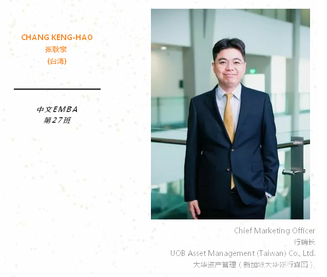 本人服务于资产管理行业十多年。曾任职富达国际(Fidelity)零售/法人事业部门主管, 并创设富达台中分公司。宏利金融(Manulife) 产品开发部门及行销部门主管等职务。目前任职于大华资产管理担任首席营销官(Chief Marketing Officer)。我的工作范畴包括共同基金、避险基金及私募基金等相关金融产品研发,产品及企业品牌行销,法人及零售业务,跨国资源集成,公司人员管理及培训等。