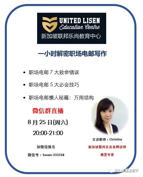 现在工作人士的福利来了! 新加坡联邦乐尚雅思中心公益微信直播课程又回来了! 为了感谢大家耐心的等待, 我们本次给大家奉献一场超实用课程: 一个小时教会你最高逼格和风范的职场电邮英语技能.