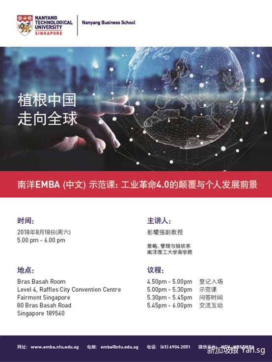 南洋商学院诚邀您出席8月18日下午在新加坡举办的南洋EMBA (中文)示范课。此次的主题为当下最热门的话题之一“工业革命4.0的颠覆与个人职业发展前景”。