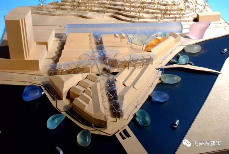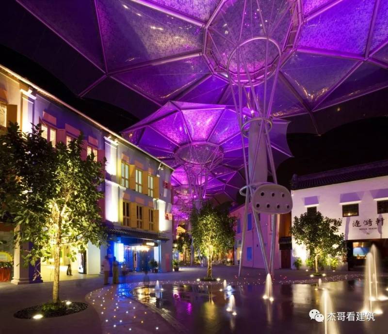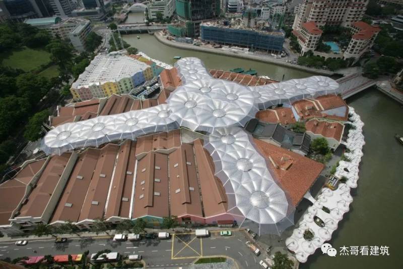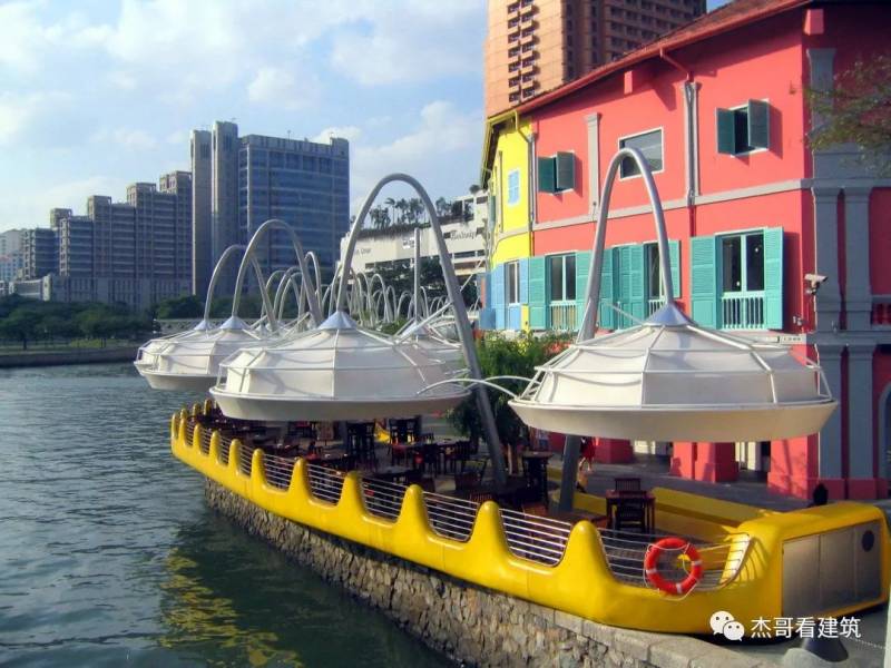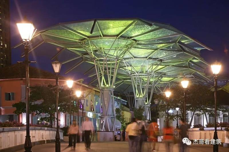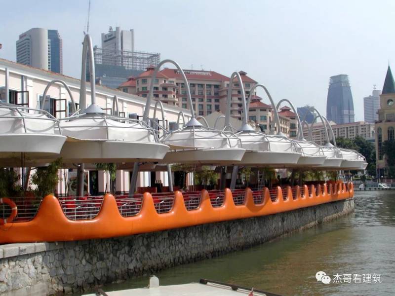 遮阳棚材料选择了可再循环利用的ETFE膜,这造型独特的膜制遮阳设施,像一把把巨大透明的遮阳伞,把建筑、步行街、行道树全部遮盖,起到了遮阳、挡雨的作用。如此巨大的透明“帐篷”引入自然光线,让街道保持自然风貌,又使码头的休闲商业活动不受气候的影响。