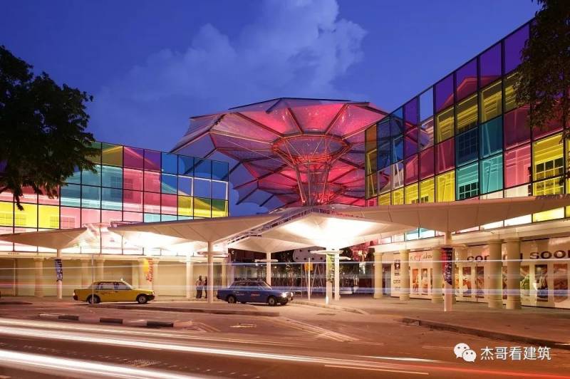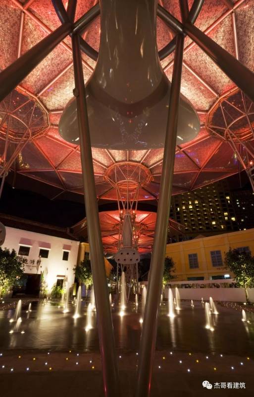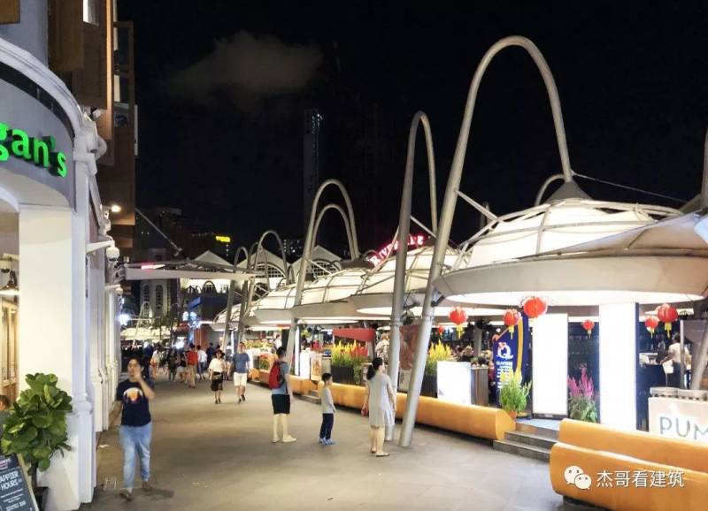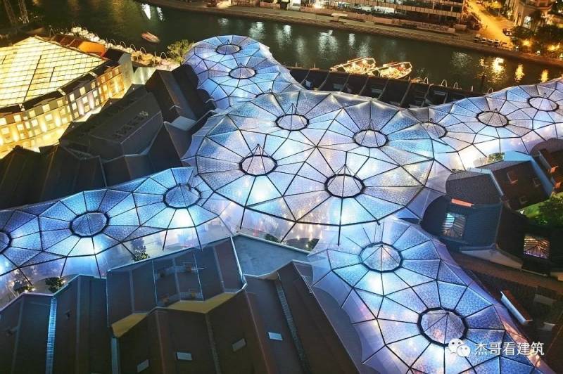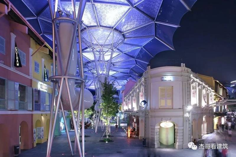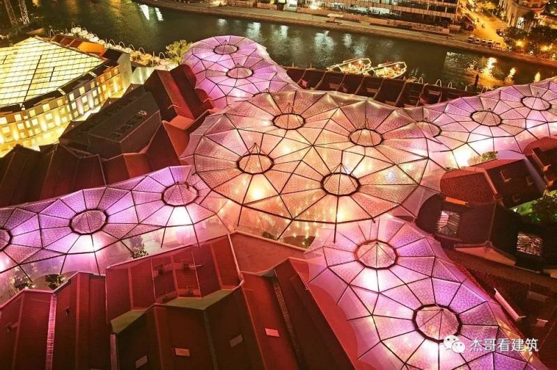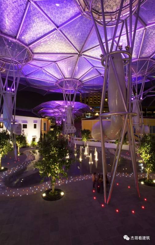 克拉码头的遮阳顶棚是一大特色,绵延不绝的排布几乎覆蓋了整个码头区域,为气候多变的新加坡遮风挡雨。白天的顶棚,通透无奇;而一到夜晚,它也开始绽放出迷人的魔力,随着节奏,变幻出不同的色彩,极具风情。
