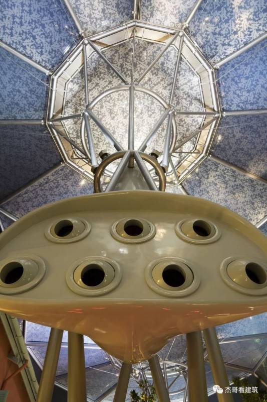 顶棚支架上,放置的是空调设备,做成一种生物造型。