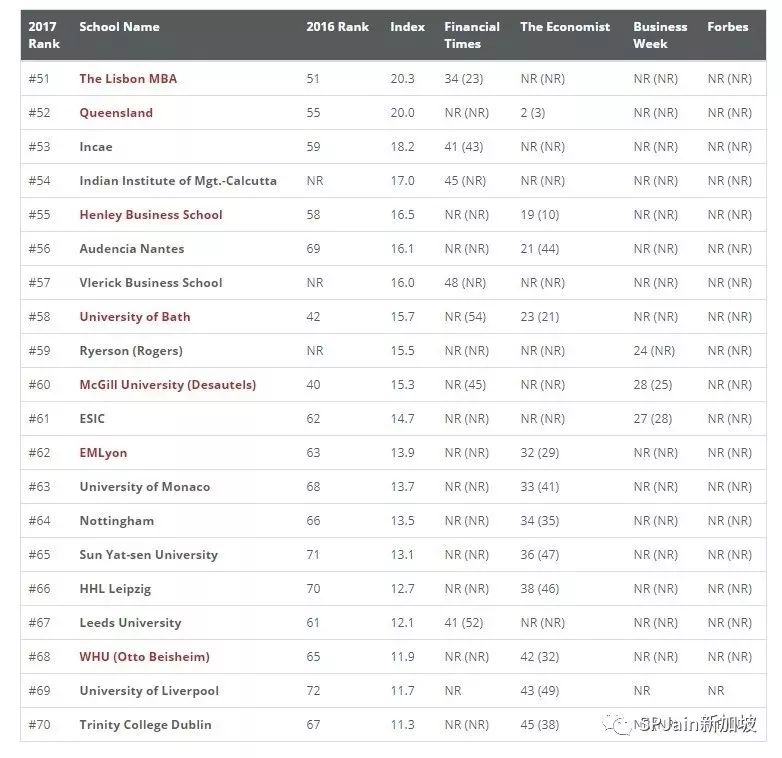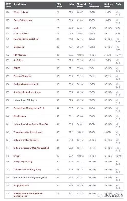 SP Jain全球管理学院2011-2017的各大商学院榜单的世界排名