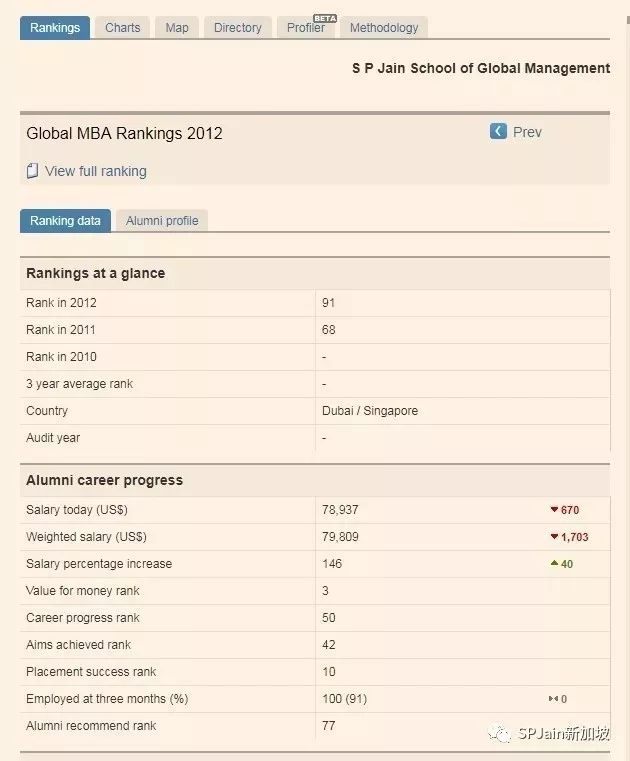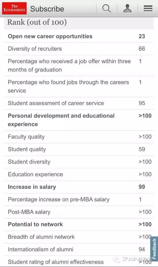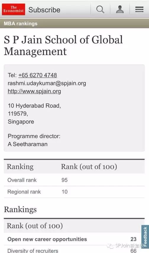 2015年经济学人最佳商学院排名中, SP Jain商学院世界第95,亚洲第10, 但是在毕业生是否在3个月内找到工作排名中,全球第1!毕业生是否通过学校的就业服务排名中, 全球第1!MBA毕业生薪水前后对比涨幅 ,全球第1!