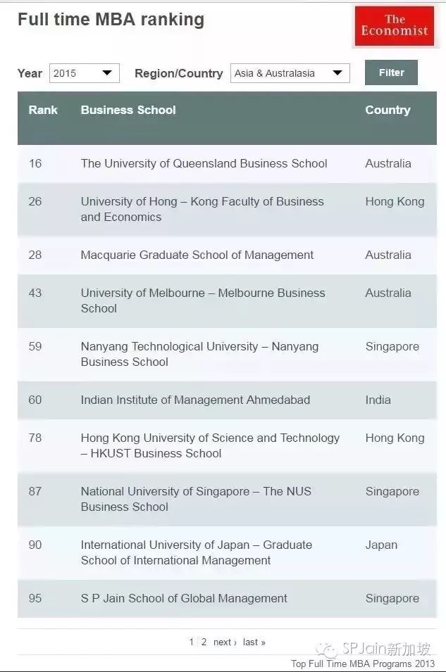 目前在世界范围内,最著名的三大商学院类排名就是Forbes 福布斯,Economists 经济学人和Finanical Times 金融时代。作为新加坡政府邀请入驻的外国源流大学S P Jain 全球管理学院, 让我们一起看看它这些年的在商学院排名的表现: