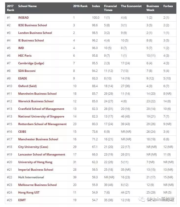 2017年9月25日,福布斯Forbes发布2017年世界最佳商学院暨世界最佳1年制MBA课程排名榜单!此榜单罗列的是除美国本土以外的世界最佳商学院排名。