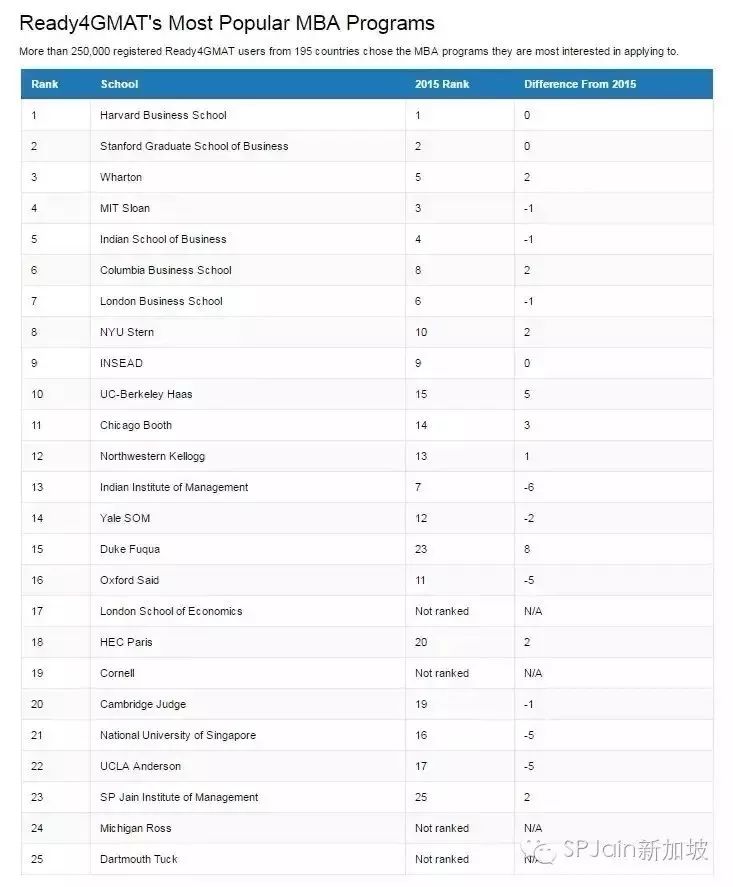 世界最大的GMAT备考网站 Ready4GMAT 2016 评选的全球最受欢迎商学院排名中: SP Jain商学院全球排名23。这份榜单中哈佛商学院独占鳌头,斯坦福商学院和宾夕法尼亚大学的沃顿商学院分居二三。亚洲大学中只有新加坡国立大学商学院上榜排名21,SP Jain全球管理学院亚洲第2。