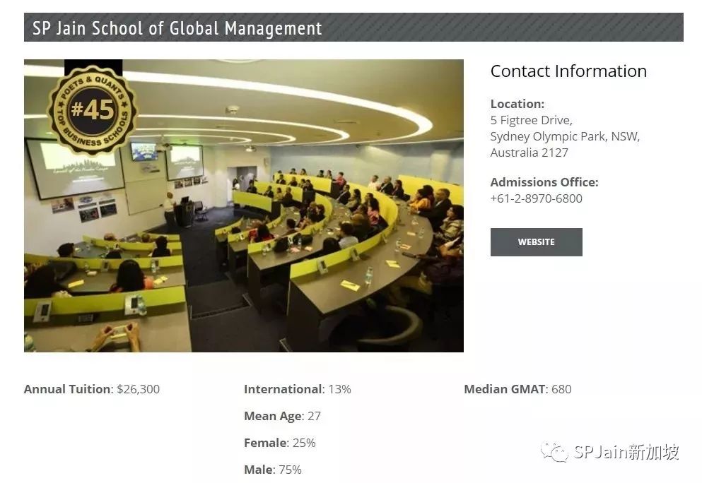 在美国著名商学教育资讯网站Poets&Quants(P&Q)最新公布的2017国际MBA排行榜中,SP Jain 全球管理学院连续第5年入榜, 名列世界45位。在新加坡地区仅次于Insead, NUS 和NTU, 位列第四。在澳洲地区仅次于墨尔本大学和麦考瑞大学,位列第三。该排名综合4大主流权威媒体的排名得出,包括《金融时报》、《经济学人》、《彭博商业周刊》和《福布斯》。