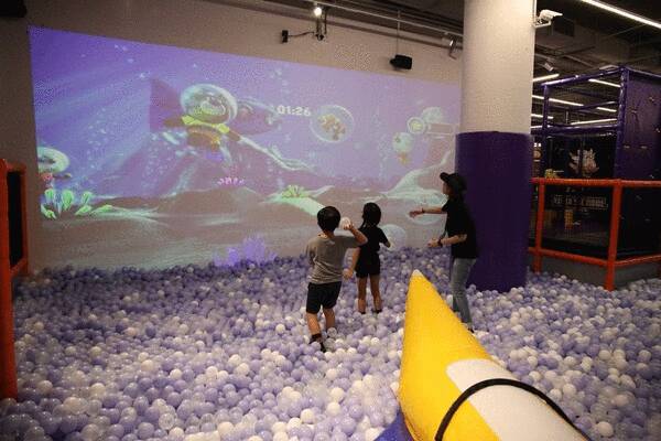 AR 游戏区是体现KIZTOPIA 尖端科技的游乐区域。将墙壁嵌入AR 交互功能,把塑料球丢向墙壁上不断变换的目标区域。在欢乐中感受科技的力量。