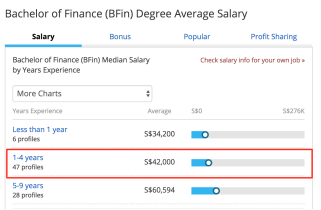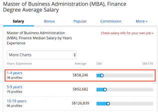 具有1-4年工作经验的Bachelor of Finance (BFin) 本科毕业生平均年薪为$42,000。同样工作年限的MBA硕士毕业生年薪为$58,246,相距$16,246。(见下图)