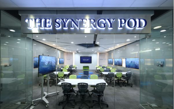 Kaplan 斥巨资打造的高科技智能教室也将被应用在授课中,每一间智能教室装备6个智能学习板,每桌都配备一个智能平板以及一个超大幕墙屏幕。桌面可以直接用来书写,回答问题,翻转过来后就变成了演示文稿和展板;座位可以灵活摆放,方便小组讨论,方便学生从多种渠道获得信息或是演示分享。