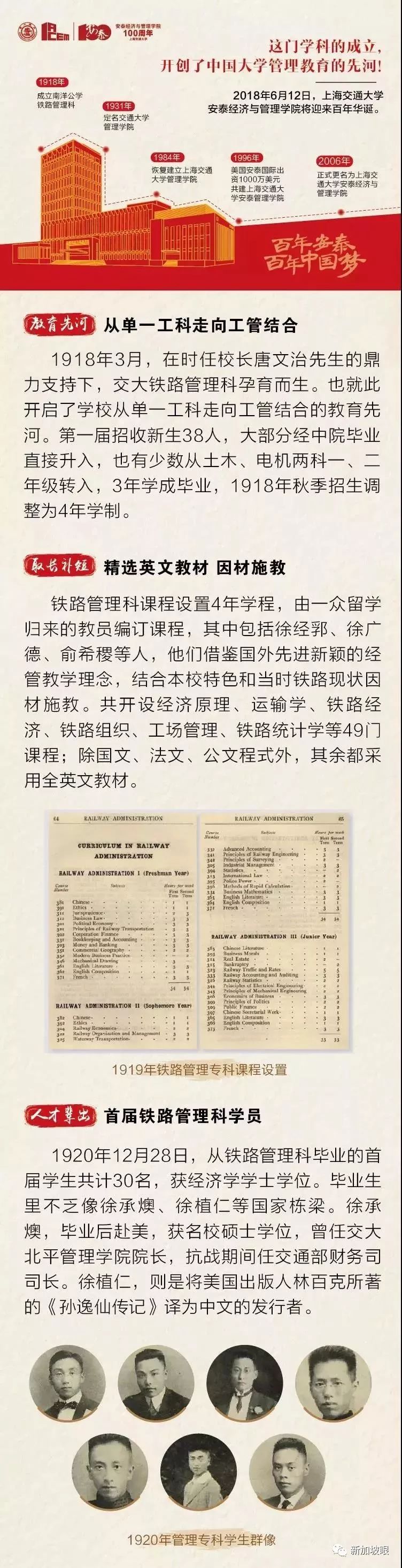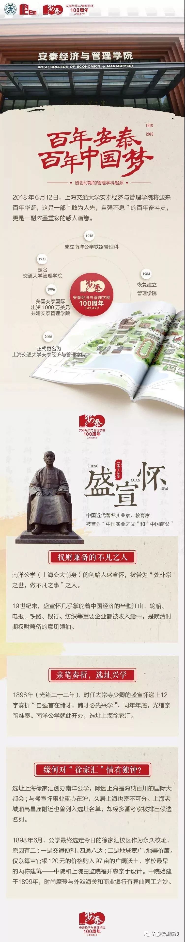 1918年,在时任校长唐文治先生的鼎力支持与关怀下,交通大学成立铁路管理专科,开中国管理教育之先河。铁路管理专科几经发展完善,在1931年定名为管理学院,与工学院、理学院学科互补,资源协同整合,成为支撑交通大学培育人才的三大支柱学科之一。其后风云变迁,沧海桑田,凤凰涅槃,浴火重生。1984年恢复建院之后,学院借中国改革开放经济腾飞之势,重起航帆,再创辉煌。恢复建院至今三十多载春秋,学院成为国内第一家通过AMBA、EQUIS、AACSB三大权威国际认证的商学院(2011年);在QS全球高校排名中,上海交通大学会计与金融、商务与管理、经济学与计量经济学、统计与运筹等四大经管学科全部保持百强,其中商务与管理连续三年进入50强(2016-2018年);学院四大核心项目在英国《金融时报》FT全球排名中连创历史新高(2017年):MBA全球第34位;高管教育定制项目全球第8位;管理学硕士全球第32位;EMBA全球第6位。基于如上之佳绩,学院在2018年英国《金融时报》亚太区商学院排名中荣膺榜首。
