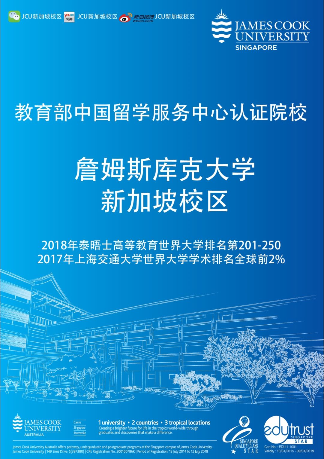 詹姆斯库克大学新加坡校区是新加坡第一所获得教育信托星级认证(EduTrust Star)的院校,并且于2016年荣获新加坡素质等级星级认证(SQC Star)。大学于2018年初获得中国(教育部)留学服务中心学历学位认证!