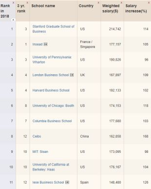 不信?看看Financial Times 2018最新MBA排名和薪水涨幅数据