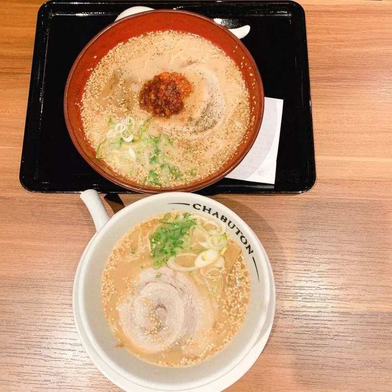 据说这家店的创始人森住康二Yasuji Morizumi是世界上第一个星级米其林拉面厨师,Chabuton的拉面有四种汤底, tonkatsu(豚骨)、tonkatsu shio(盐渍豚骨)、miso(味增)和shoyu(酱油)。有两个分量可以选择,小份8.3大份11.9。而对于面条的要求也可以选择软、硬两种要求。汤底的话更可以选择油量和盐量。最后我们选择了少油少盐的tonkatsu和tonkatsu shio,外加糖心蛋、海苔、豆芽。