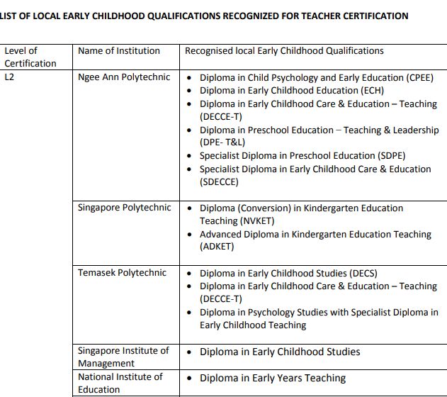在新加坡,你还可以选择私立学校学前教育专业,成为幼儿老师。但是一定要选择新加坡幼儿保育署(ECDA)和新加坡精深技能发展局(SSG)双重认证的学校。这样获得的学历才能得到认证,成功申请教师资格证书。