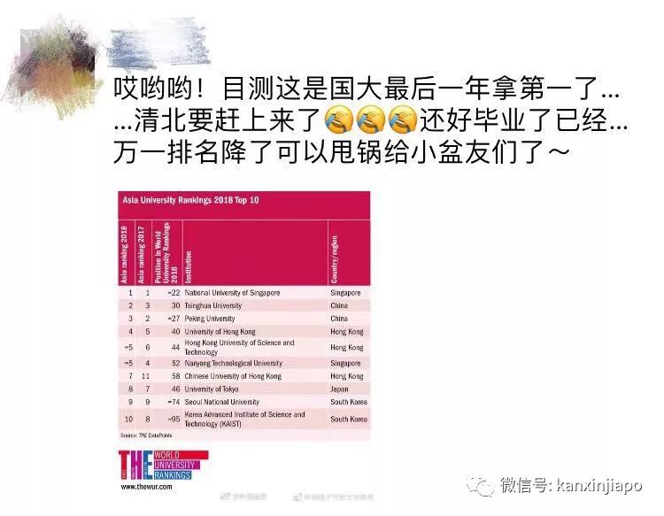(这里要跟大家科普一下,去年QS的排名,南洋理工大学把国大反超了,成了亚洲第一。“国大欠费”梗便开始在童鞋们中疯狂流传,那今天这一波,南大排名不升反掉,也是欠费了?呵呵~)