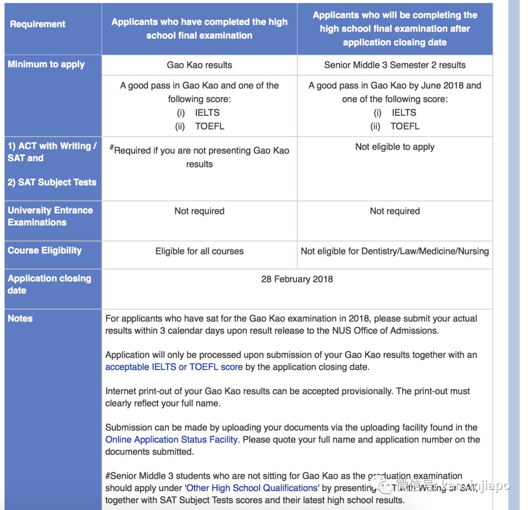 中国高考生申请新加坡国立大学要求: