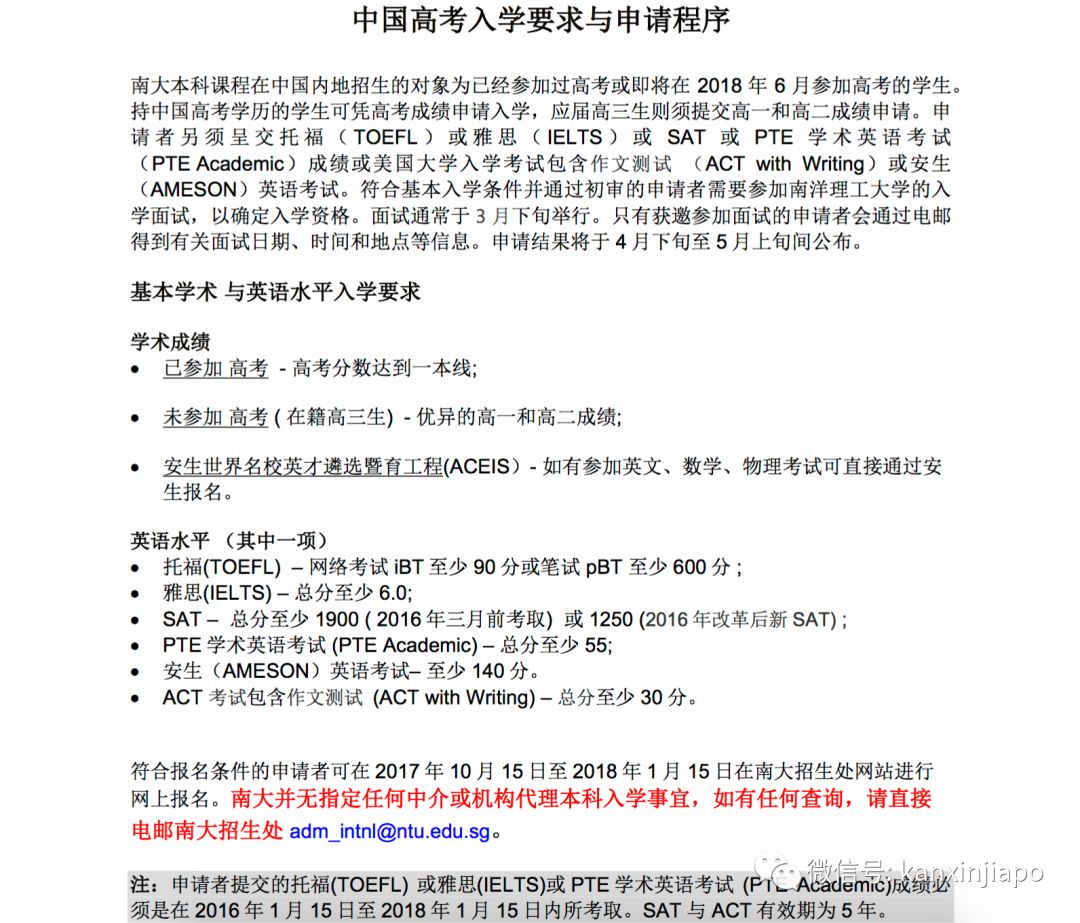 中国高考生申请新加坡南洋理工大学要求: