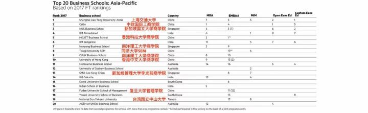 上海交通大学安泰经济与管理学院(Antai College of Economics and Management)在亚太地区商学院排行榜中位列榜首。同在上海的中欧国际工商学院排在第二位。