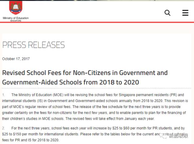 新加坡教育部(MOE)今日发布公文表示:将对在新加坡政府和政府资助学校读书的PR和国际学生未来三年(2018-2020)涨价,每月学费将上调新币25元至60元, 非永久居民的外籍学生每月学费上调新币25元至150元不等。