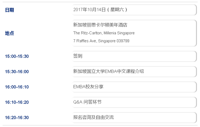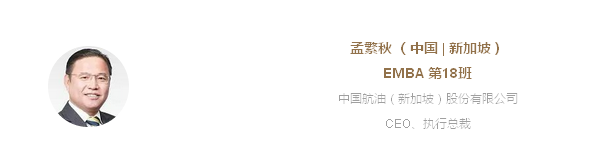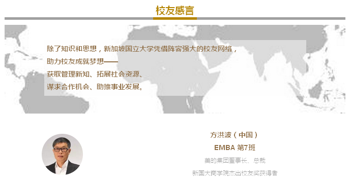 全球视野,融汇贯通。新国大EMBA的最大亮点是在全球不同国家地区进行学习。与当地一流的商学院和企业交流,考察当地商业环境,教授们严谨的教学和同学们思辨的讨论,让我们对亚太商业环境的变迁和全球化有了进一步的了解,对中国市场未来的发展趋势和中国企业如何走出去有了全新的认识。新国大EMBA是我人生和事业的加油站!