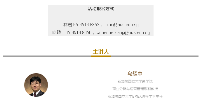 欧洲工商管理学院(INSEAD)管理学博士, 新加坡国立大学商学院商业分析与运营管理系副教授,新加坡国立大学中文EMBA课程学术主任。乌博士的研究兴趣集中于行为科学与企业运营的交叉领域。他的研究成果发表于《管理科学》,《运筹学》,《制造与服务运营管理》,《运营管理期刊》等国际学术期刊。在新加坡国立大学商学院,他目前为EMBA硕士学位课程(新国大EMBA)、高级公共行政与管理硕士学位课程(MPAM)开设管理决策方面的课程,同时也为高层管理发展项目(EE)提供有关现代管理者的判断与决策等方面的教学。新加坡国立大学新加坡国立大学(以下简称:新国大)始创于1905年,是历史悠久的世界级名牌大学。根据泰晤士高等教育和QS等全球大学排名,新国大已连续多年蝉联亚洲第一。新国大拥有来自全球100多个国家和地区的38,000名学生,学生的多元化背景和国际化环境造就了国大三个校园16个学院的蓬勃生命力。新国大在工程学、生命科学和商业管理等诸多领域研究成果蜚声海内外。