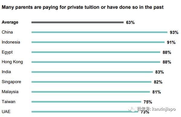但在是否将孩子送去私人补习这项排名上,新加坡竟然只有82%的父母会将孩子送去私人补习,排在第6位!而排在第1位的是谁呢?当然是妥妥的大天朝!有93%的父母觉得学校教育并不足以满足孩子的需求,将孩子送去私人补习。