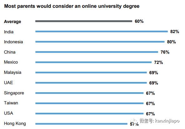 而对于远程教育这回事,新加坡家长的接受度似乎跟本地IT业的发达程度不够匹配,只有67%的家长会考虑远程大学教育,与中国台湾和美国并列第7。而同属大中华区的中国大陆(76%)和中国香港(57%)则有着非常两极化的接受度,难道说中国香港的父母更加传统,认为只有看到老师本人,孩子才能好好学习(其实并不会吧。。。)?