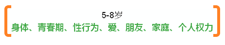 基本上是5-8岁青春期的内容,但是更加具体身体的、社会的、情感的变化女孩要准备迎接第一次月经男孩要知道勃起射精和梦遗繁殖可以发生在开始来月经的女孩和开始产生精子的男孩之间男孩和女孩到达青春期的时候是有能力生宝宝的2性行为