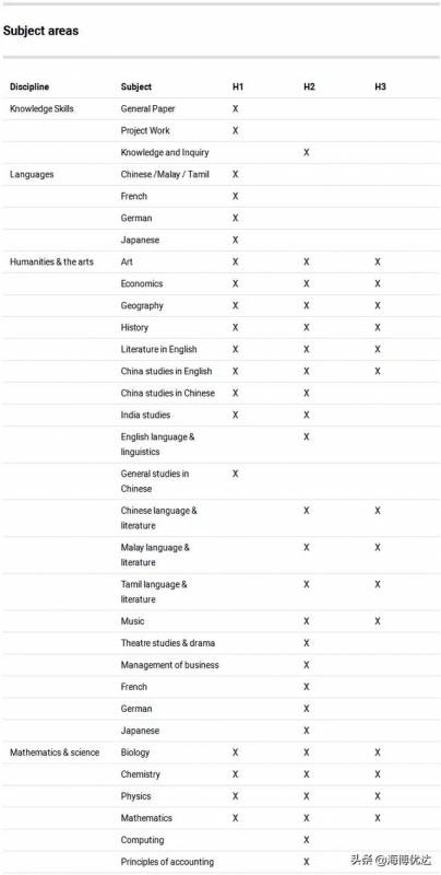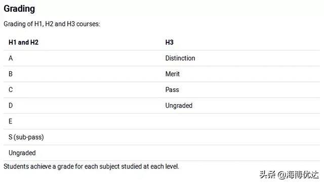 A水准课程体系按照难度分成H1、H2和H3三个等级。一般来说,H1相当于AS水平,H2相当于A-level水平;H3是H2的延伸,包含更有深度更高级的学习内容,在某一学科出色的学生可以选择H3来学习;并且不是所有科目都有这三个难度。