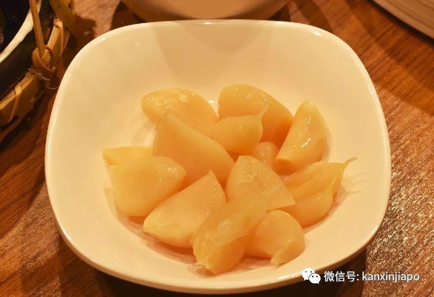 店内人气糖蒜……呃,应该叫它小吃?开胃菜?调味料……不管了,总之就是好吃。这个必须用生蒜来做,但新加坡没有生蒜,所以,都是在内蒙腌制好了空运过来的。