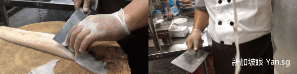 鱼片制作时若想保持口感鲜美,必须将鱼片切得薄如蝉翼。感受一下鱼捞店厨师的刀法…….