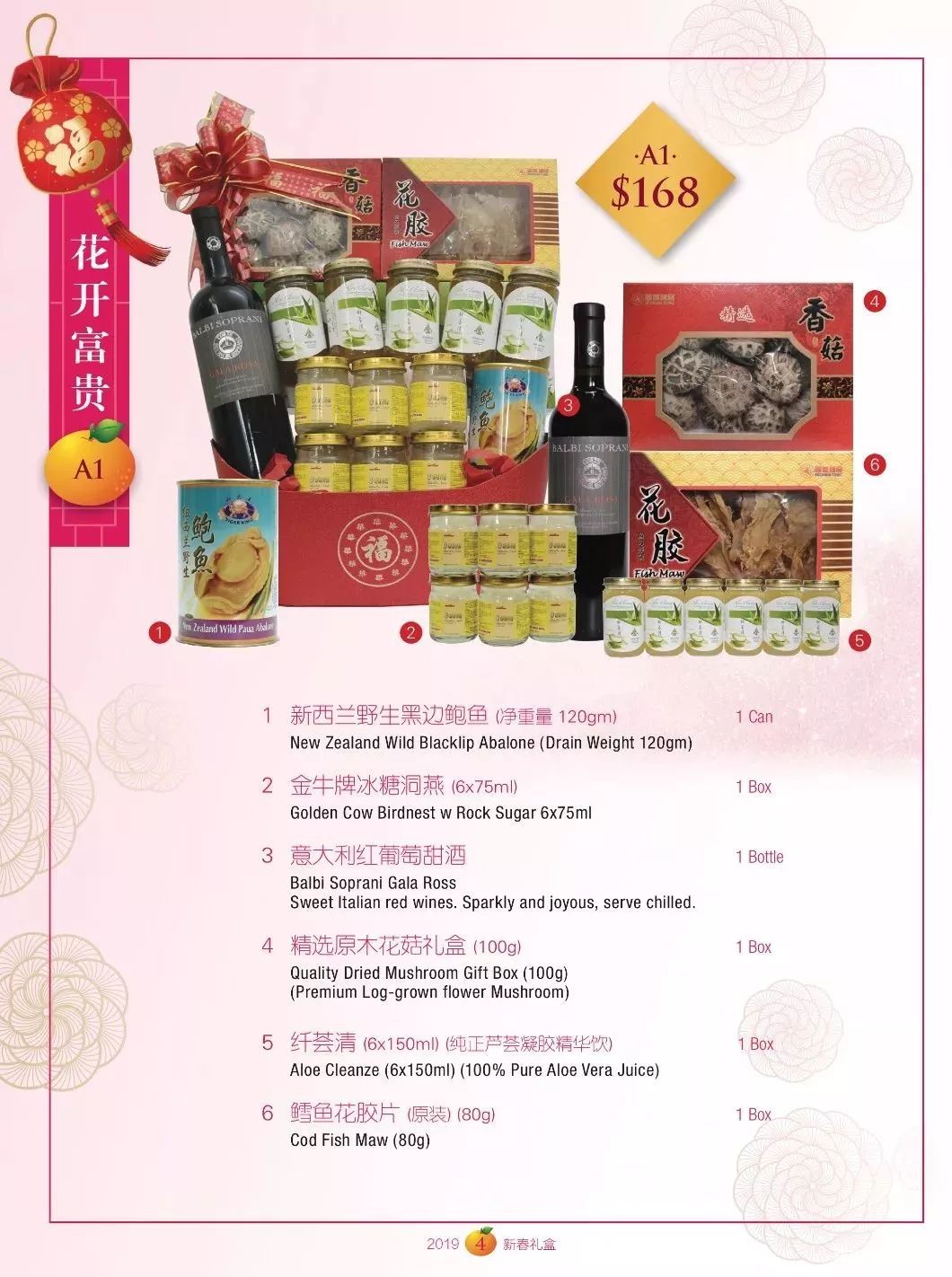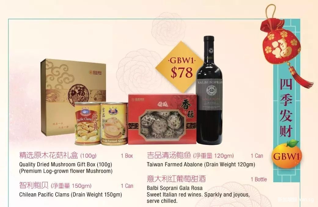最畅销的礼篮在118新币 ~ 588新币之间,推荐这个168新币“花开富贵”礼篮,“一路发”的谐音寓意好兆头外,补品种类很丰富,除了鳕鱼花胶片、意大利红葡萄甜酒、精选原木花菇礼盒,还有新西兰野生黑边鲍鱼、金牛牌冰糖洞燕和纤荟清。