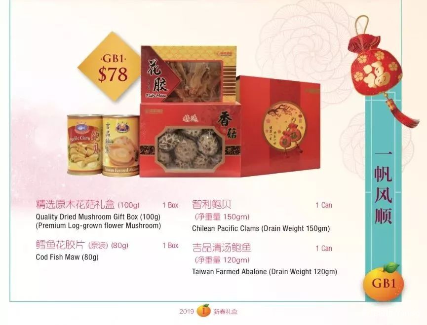 价格78新币,里面有智利鲍贝、吉品清汤鲍鱼、精选原木花菇礼盒以及鳕鱼花胶片。