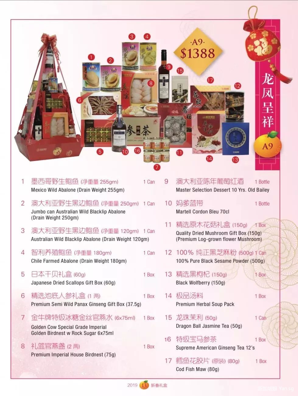 价位最高的1388新币壕华礼篮,取名龙凤呈祥。里面有17种滋补品,多到数不过来,大家自行看图吧。。