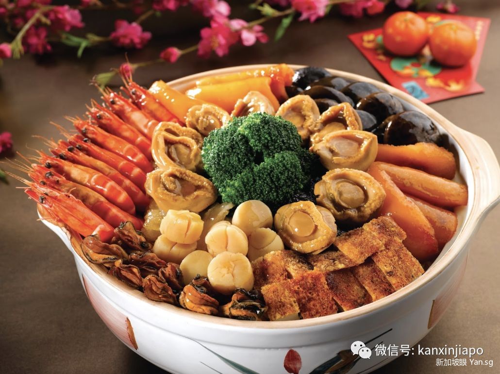 盆菜是新加坡新年宴上的一道名菜。日本干贝、澳洲进口鲍鱼等礼篮中的各种珍贵食材堆叠在木盆里,吃的便是那一份丰盛的好兆头。