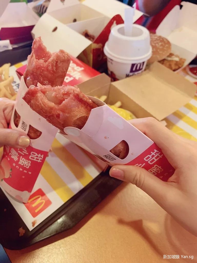 虾酱炸鸡腿风靡新加坡的虾酱鸡,曾经以汉堡内馅的形式,作为限定款短暂地在麦当劳出现过。2019年,它又杀回来了,并且做成了大鸡腿子~