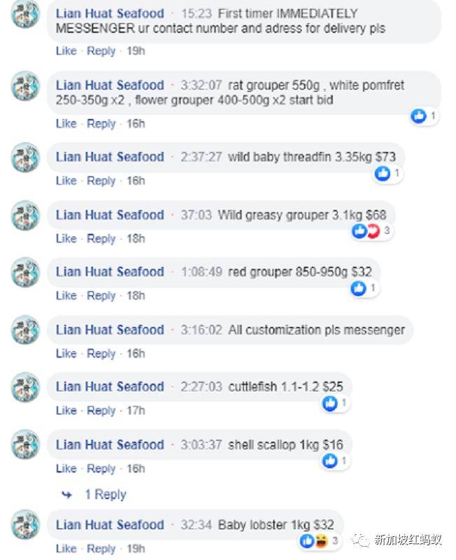 答案:大部分都是联发海产自己的留言,写明鱼的品种和价格。想买鱼的人可以直接通过面簿私信联发海产购买。