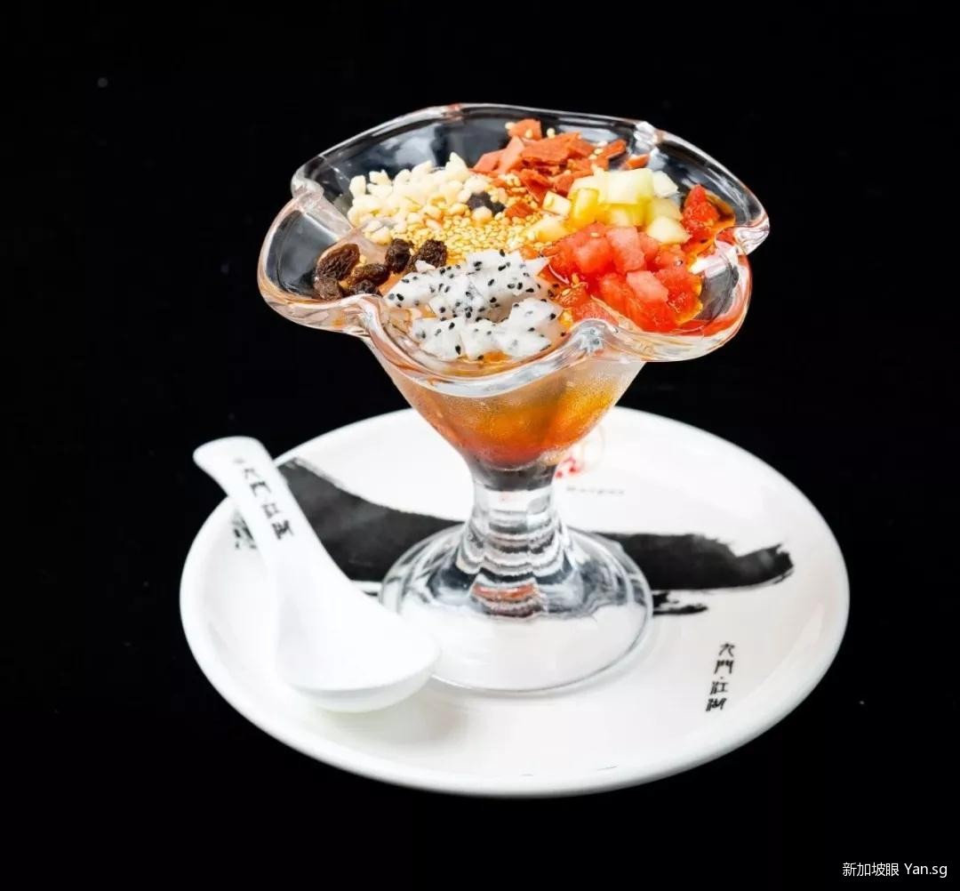 甜品可选一份,“冰粉”是中国西南地区的一道著名甜品,是用冰粉树的籽揉搓出来的。五爷手工冰粉爽滑、透明、美味的“天然果冻”。