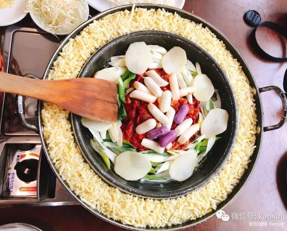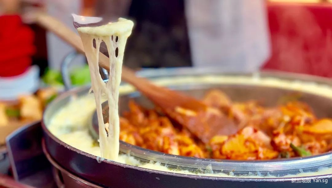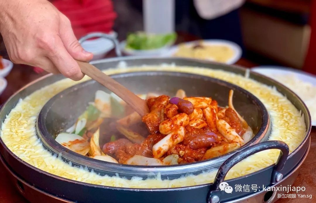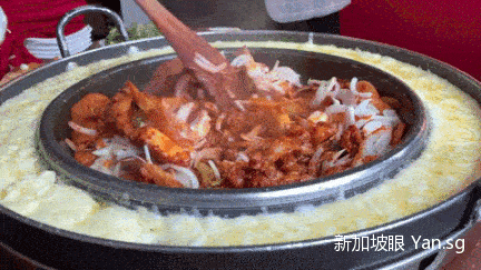取完小菜,重头戏来了!我们点的是韩剧中经典的招牌铁板芝士炒鸡!其实他们这里有分单人锅和共享锅,共享锅适合3-5人吃。