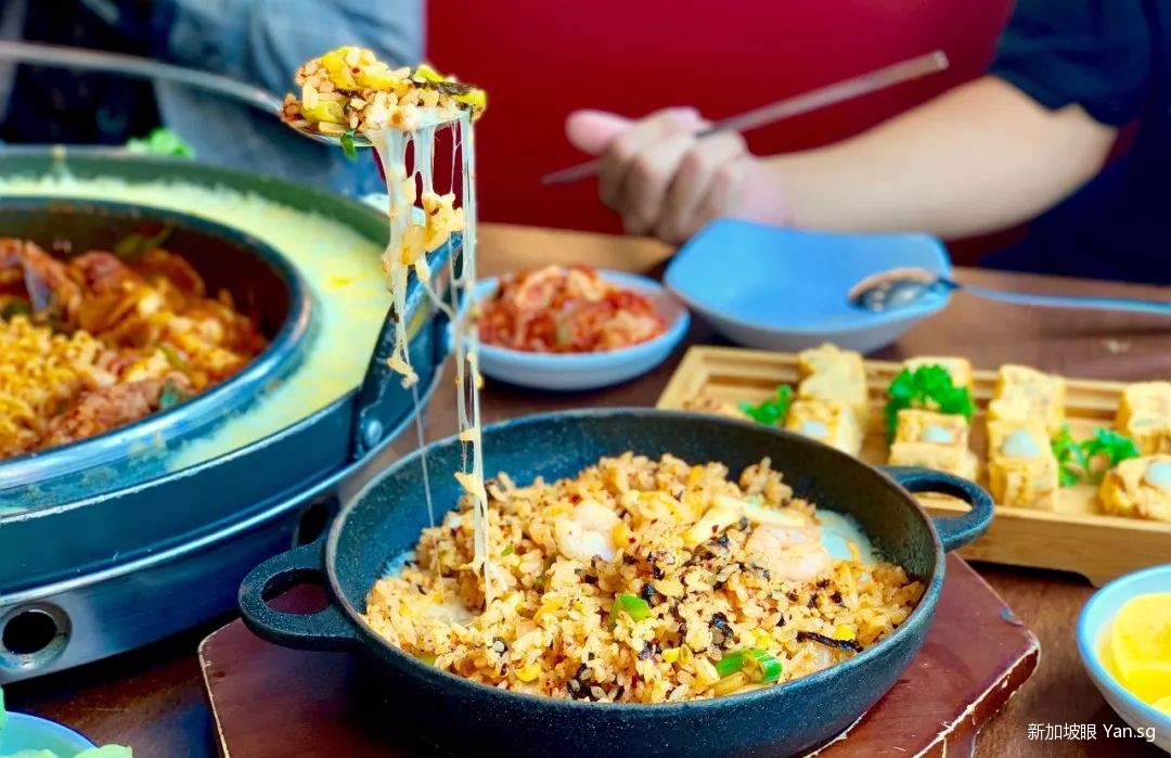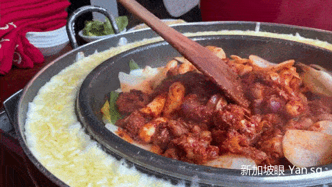炒鸡铁板芝士炒饭,将花枝、青葱、海苔、辣椒配合韩国进口的大米、芝士一起翻炒。韩国大米的口感和新加坡世面上常见的泰国米差别较大,口感软糯有黏性,不会有明显的颗粒感。