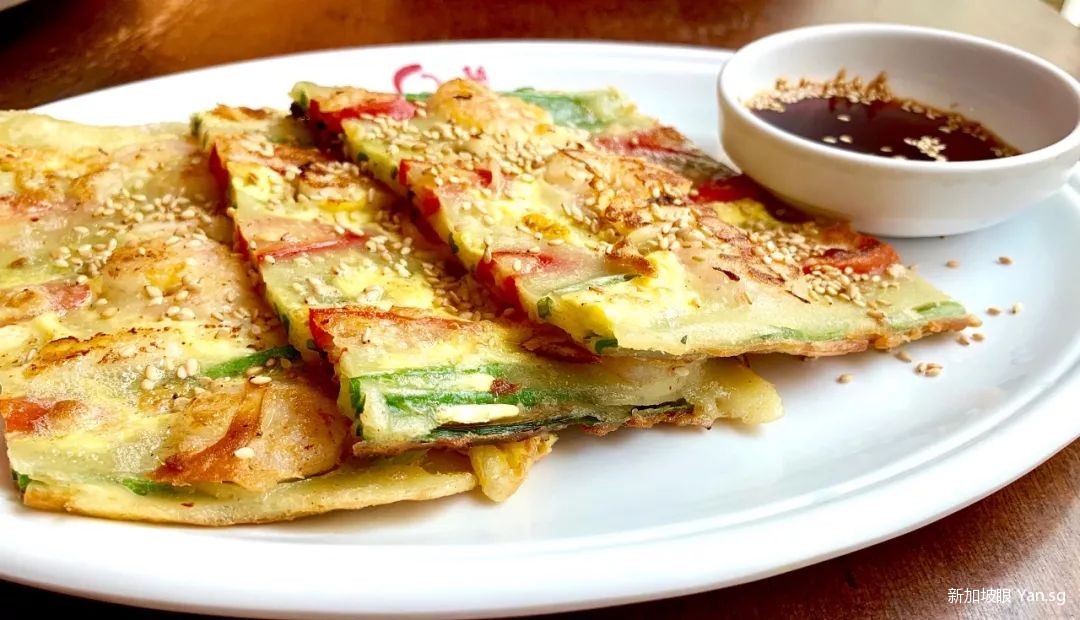 除了招牌铁板鸡,你还可以在这里吃到很多经典的韩式料理。比如,传统韩式海鲜煎饼。里面加了虾仁、芝麻、香葱和辣椒,配合着酱汁吃,超地道!