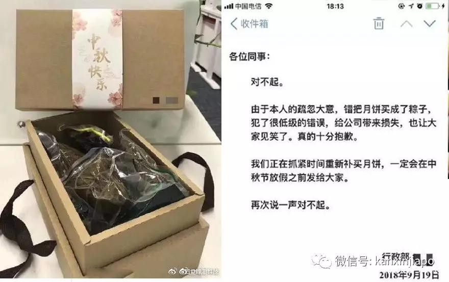原来是某家公司的员工福利,本来送中秋节月饼,结果变成了粽子,这就尴尬了~经查证,是行政小妹采购月饼时出了错……