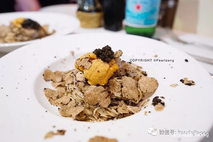 特别推荐的就是他家的这道特色的面,因为里面的材料会让人兴奋的抓狂,里面有日本北海道的带子及海胆,价格是$88/份,如果另外加鱼子酱24,加黑松露是16。松露真的撒得特别的豪迈,吃的时候气味在口腔中蔓延开来了,融合了海胆跟带子的鲜甜,本年度最爱的面。