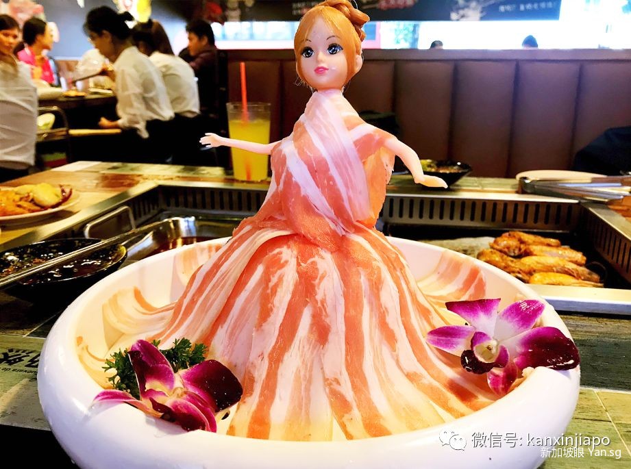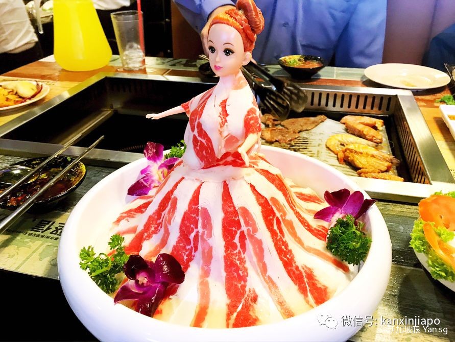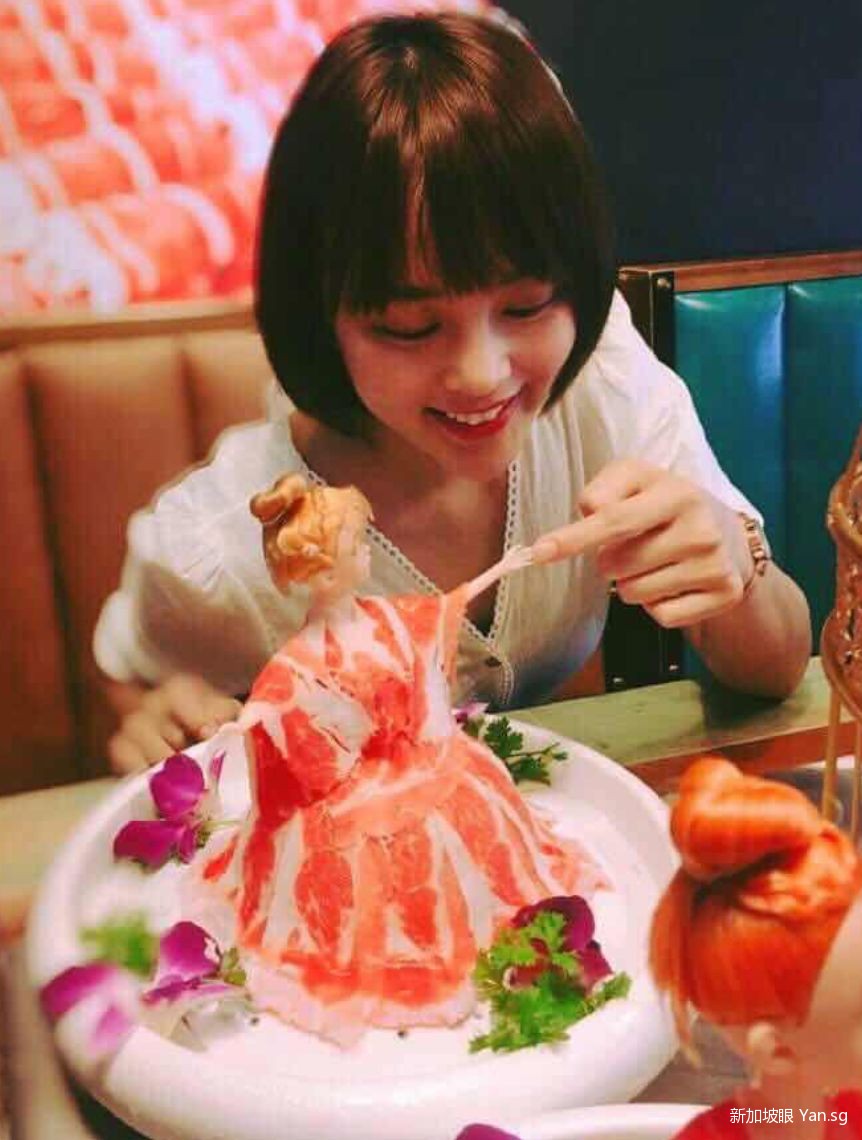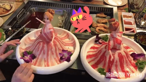 先来看看人气芭比。她身上穿的是正宗澳洲肥牛小礼裙~肥瘦相间的薄肉片,做成了美丽的红白相间火锅礼服。