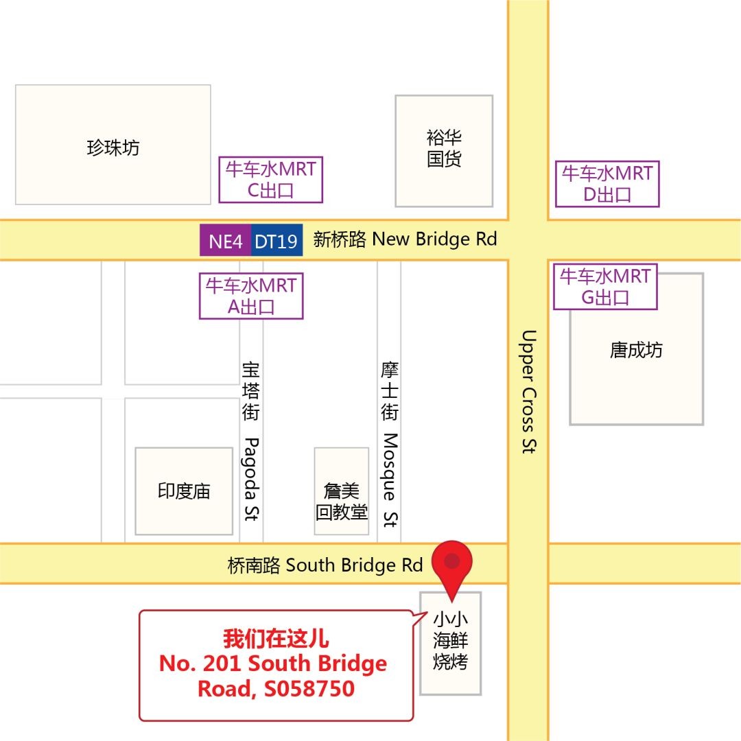 牛车水地铁站A出口,出来直走到头,过马路往左走,蓝色的招牌。